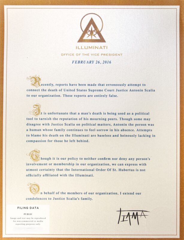 The Illuminati extends our condolences to Justice Scalia’s family and hopes to address recent rumors regarding our organization. Read our public letter and transcription below.