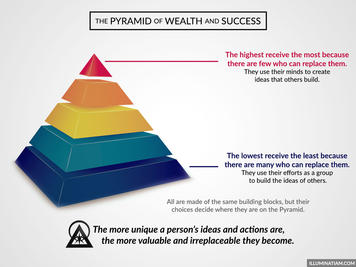 Wealth and success are like streams of water running down a pyramid. The highest receive the most because there are fewer while the lowest receive the least because there are many. Before the water can reach the bottom, first it must run through all the others above it. Though the lowest support the weight of all who are above them, they are numerous and easily replaced — unique individually, but common together. A person climbs higher by becoming less like those below them.